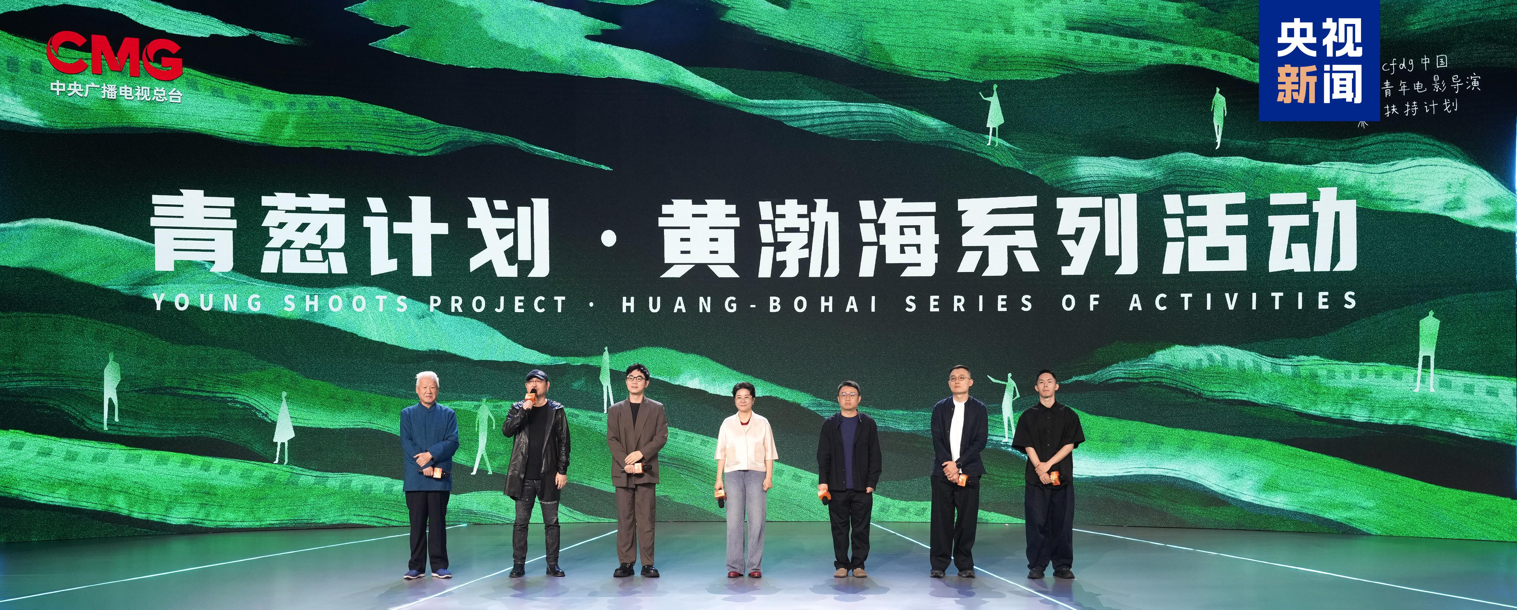 △导演谢飞、乌尔善、董成鹏、李少红以及青翠青年导演龙凌云、贵宾、张旭煜现场推介“青翠打算黄渤海系列勾当”。