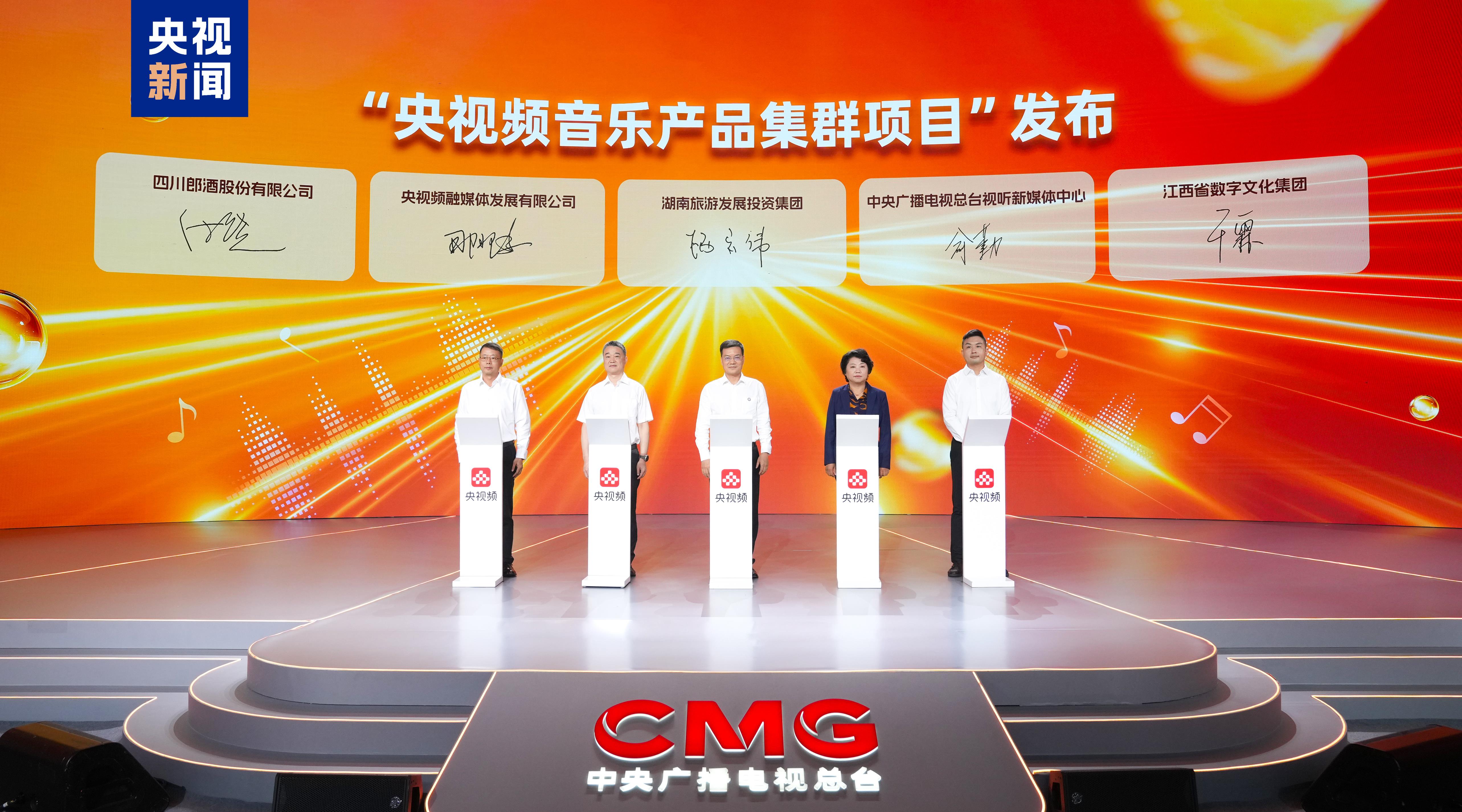 △湖南旅逛成长投资集团无限公司董事长杨雄伟、总台视听新核心副从任俞勤、央视频融成长无限公司副总司理那珂嘉、江西数字文化集团副总司理干霖和四川郎酒股份无限公司副董事长付饶配合发布“央视频音乐产物集群项目”!
