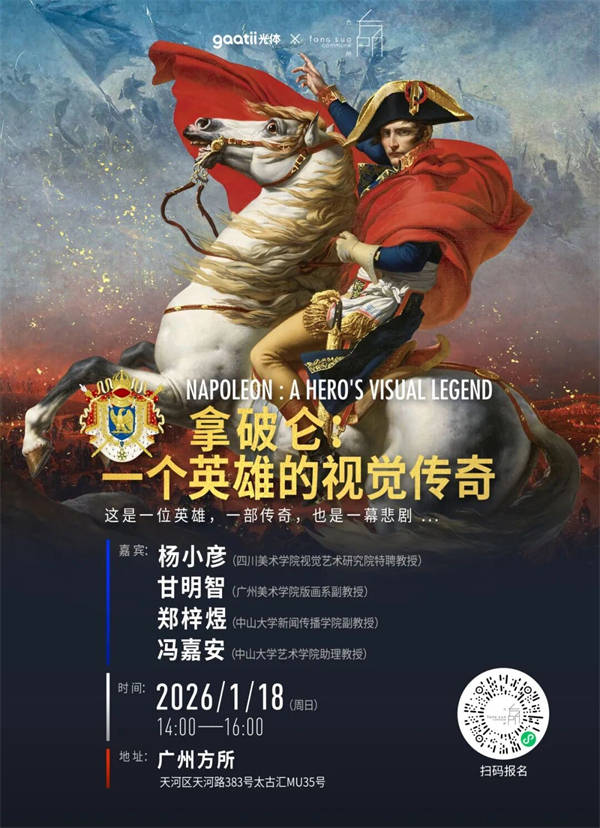 嘉宾:杨小彦(艺术评论家、视觉研究学者、艺术家)、甘明智(广州美术学院版画系副传授)、郑梓煜(中山大学旧事学院副传授)、冯嘉安(中山大学艺术学院帮理传授)穿越拿破仑时代的艺术现场,感触感染汗青正在画布取器物间的实正在脉动。本次以拿破仑期间的宝贵绘画、地图及手迹为线索,一场“以画证史”的沉浸路程。杨小彦传授将率领我们透过图像,解读、和平取文明若何正在光影中交错,呈现小我取时代共振的澎湃叙事。1月18日,诚邀您走进这幅流动的汗青画卷,正在视觉取故事的层层交织中,体验一场逾越两百年的对话。